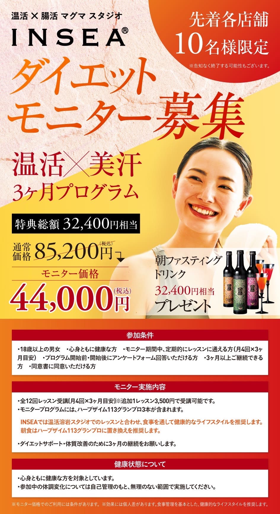 - INSEAのスタジオは、富士山の溶岩石を水蒸気で温めています。一般的なホットヨガのようにヒーターや加湿器を使わず、豊富なマイナスイオンとミネラルが充満した空間で、自然に運動ができるので、今までのホット環境が苦手だった方も一度体験していただければ、違いがわかります。